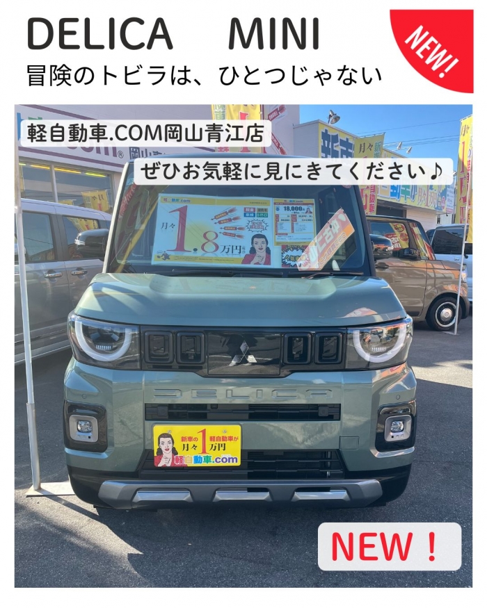 こんにちは!軽自動車.com岡山青江店です(^^)/ 今日はミツビシから出ている NEW「DELICA MINI」のご紹介です! 店頭にあるのは、 Tプレミアムというグレードで、月々1.8万円のボーナス払い6万円となっております。 ボディ色は、アッシュグリーンでとってもかっこかわいい(続きを読む)