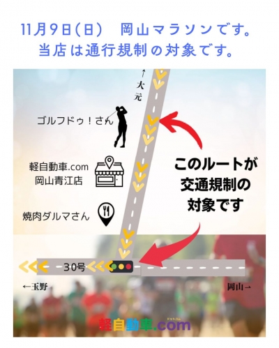 ★岡山マラソン時の通行規制のお知らせ★ 2025/10/31 軽自動車.com岡山青江店です(^^♪ お知らせです! 11月9日(日)は岡山マラソンですね✨ 軽自動車.comが面する大通りもマラソンコースに含まれています。 ランナーが通過する8:30~10:30頃は、通行規制の対象となっています。 詳しくは2枚目の画像をご覧ください。 当日は、サービス稼働日ではありますが、整備のご予約は午後1時の枠からスタートさせていただきます。 あらかじめご了承ください。 よろしくお願いいたします(^^)/